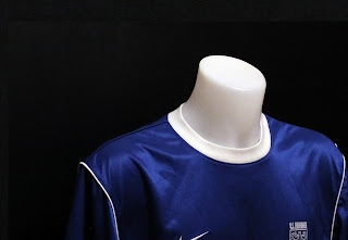 Maglia ABM indossata dalla U.S. Chiavennese durante il campionato di Prima Categoria 1986/87. Retrocessa dal campionato di Promozione alla fine della stagione precedente, la società biancoazzurra non riuscì a risalire concludendo il campionato a metà classifica.